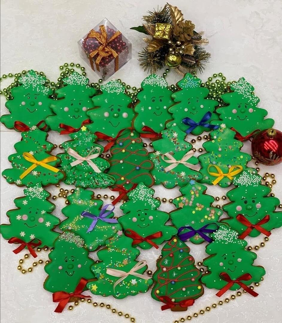 Яркие новогодние прянички в виде украшенных праздничных елей